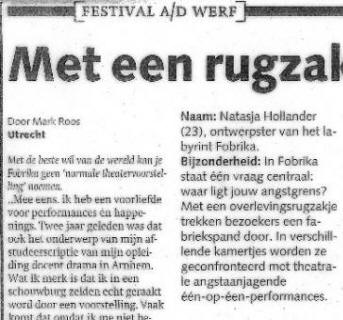 (Recensie Utrechts Dagblad Mark Roos): "In Fobrika, een project naar een idee van Natasja Hollander, worden bezoekers een labyrint ingestuurd. Hoe reageer je als je onder druk wordt gezet iets te doen wat je eigenlijk niet wilt? Hoe dichtbij mag iemand komen? Hoe reageer je in onalledaagse, angstaanjagende situaties? Het zijn vragen die je jezelf stelt tijdens de bijzondere rondgang langs een tiental kamertjes in de voormalige rechtbank. Fobrika, dat je gedeeltelijk geblinddoekt doorloopt, gaat behoorlijk ver. Het speelt op een vernuftige en speelse manier in op menselijke zwakheden. In feite ben je in Fobrika meer deelnemer dan toeschouwer."